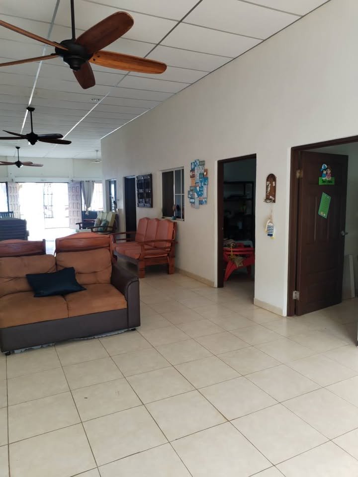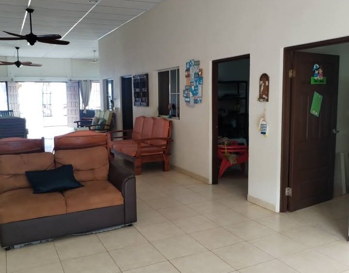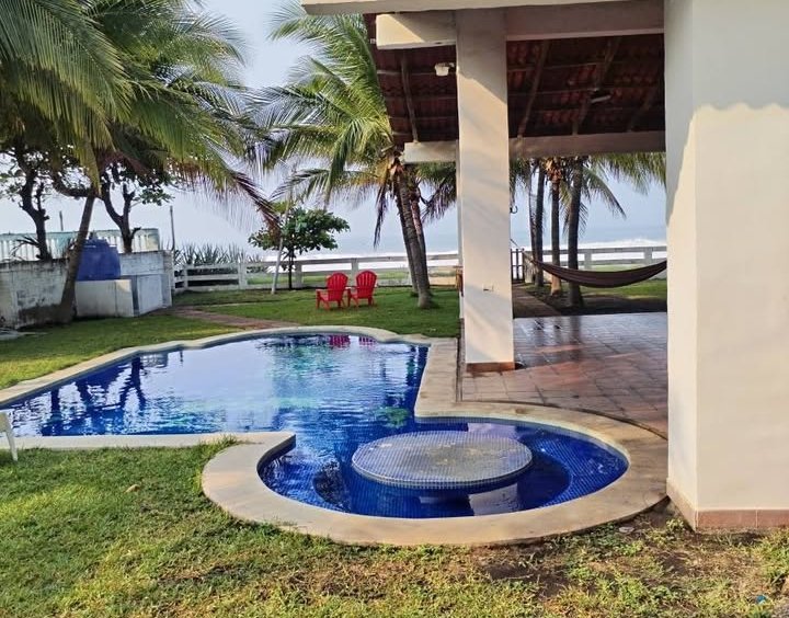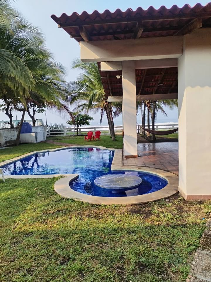 4 habitaciones grandes con capacidad para 4 camas tamaño matrimonial y cada una su baño amplio ( 3 de ellas con su aire acondicionado) 1 habitación pequeña para dos camas tamaño semi matrimonial con su baño y aire acondicionado sala amplia de Video cerrada con vista a piscina -mar (Baños completos en total casa 5 Baños social 2 ( casa y glorieta ) Área piscina y glorieta Capacidad para 6 hamacas Sala familiar Mesa de trozo de madera para 20 personas Barra desayunador con lavado platos Área de asador de carne 1 baño social Duchas exteriores Piscina Bodega bomba piscina