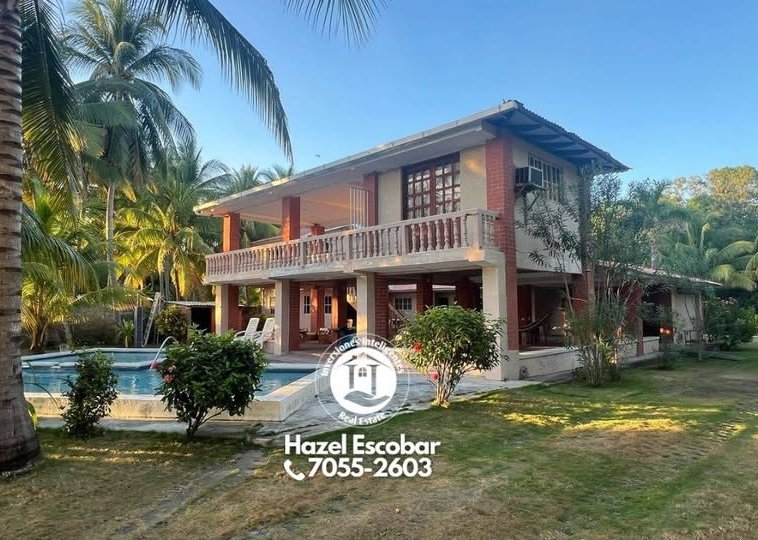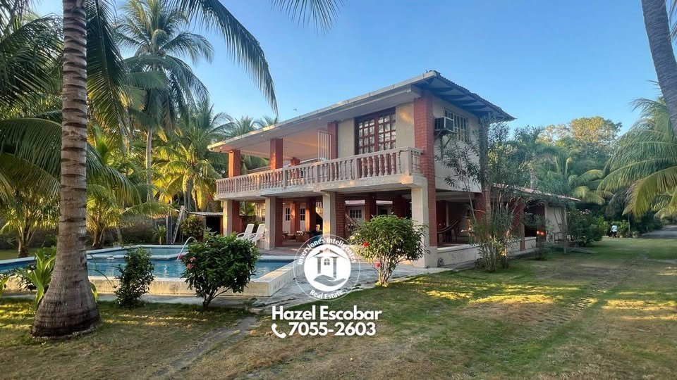 1ª fila: – Topografía plana – Frente al Mar – 7,601.64V² – Casa concepto abierto de 2 plantas de construcción mixta – Agua potable – Luz 110/220V – 5 hab/4.5 baños – Cocina – Piscina 10/10 – Casa de Cuidandero,